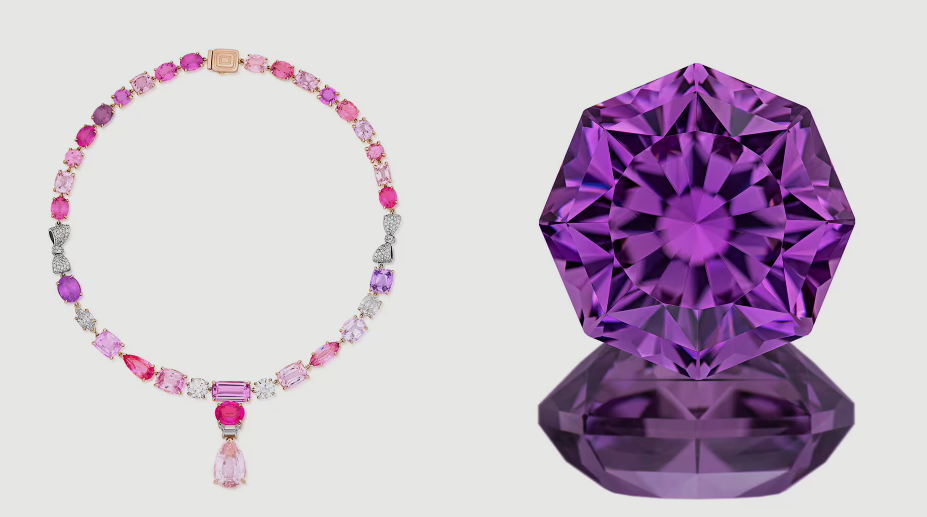 Kalung “Cotton Candy” menampilkan kombinasi batu permata yang luar biasa: kunzite berbentuk pear seberat 16,71 karat, spinel pink cerah seberat 4,05 karat, dan topaz imperial 5,65 karat. Selain itu, kalung ini dihiasi dengan total safir seberat 18,71 karat, spinel 14,99 karat, turmalin 41,70 karat, serta berlian 8,71 karat. Karya ini dipuji karena memadukan keindahan warna yang lembut dengan desain yang elegan dan modern, menjadikannya salah satu perhiasan paling menonjol di pameran.