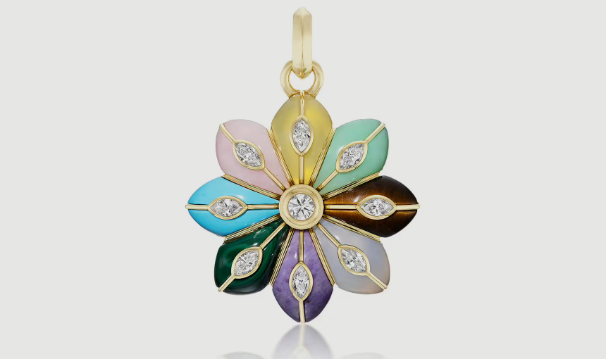 Versi kecil dari kalung inlay “Bloom” menampilkan salah satu dari delapan batu permata tersebut bersama dengan aksen berlian.