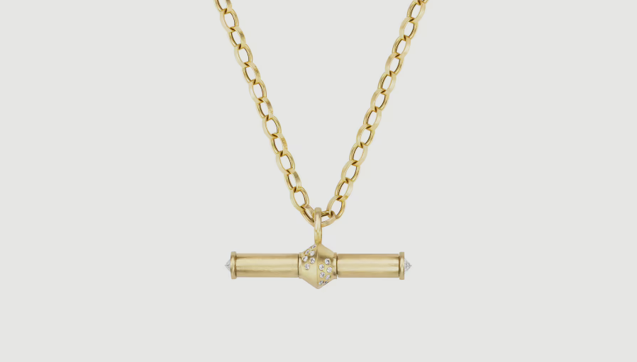 Liontin toggle ini memiliki desain modular di mana ujung-ujung yang dihiasi berlian terbalik dan tabung emas bertekstur disikat dapat dilepas dari bagian tengahnya, sehingga perhiasan ini dapat dikenakan dengan berbagai cara.