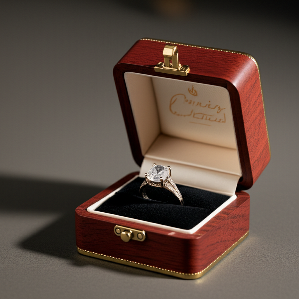 • Bantalan atau Penahan Cincin: Pastikan ada bantalan atau slot yang pas dan aman untuk menahan cincin agar tidak bergerak di dalam kotak. Warna pelapis interior harus melengkapi cincin dan warna eksterior kotak.